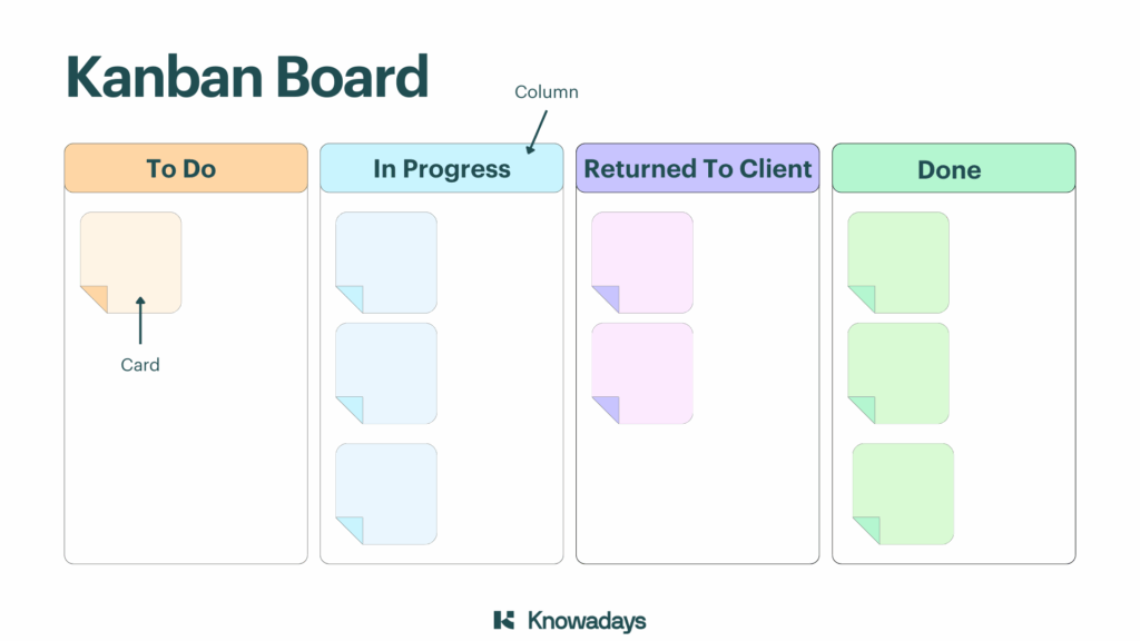 • Columns, which represent different stages of the workflow. Normally, there will be at least three columns with headings like To Do, In Progress, and Returned To Client or Done. Depending on the complexity of the process, additional columns like Review, Blocked, or Testing can be added to reflect specific phases.