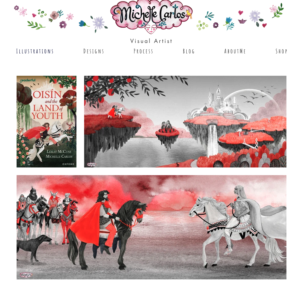 Visual artist Michelle Carlos creatively uses their own art to design the homepage of their Wix online portfolio: