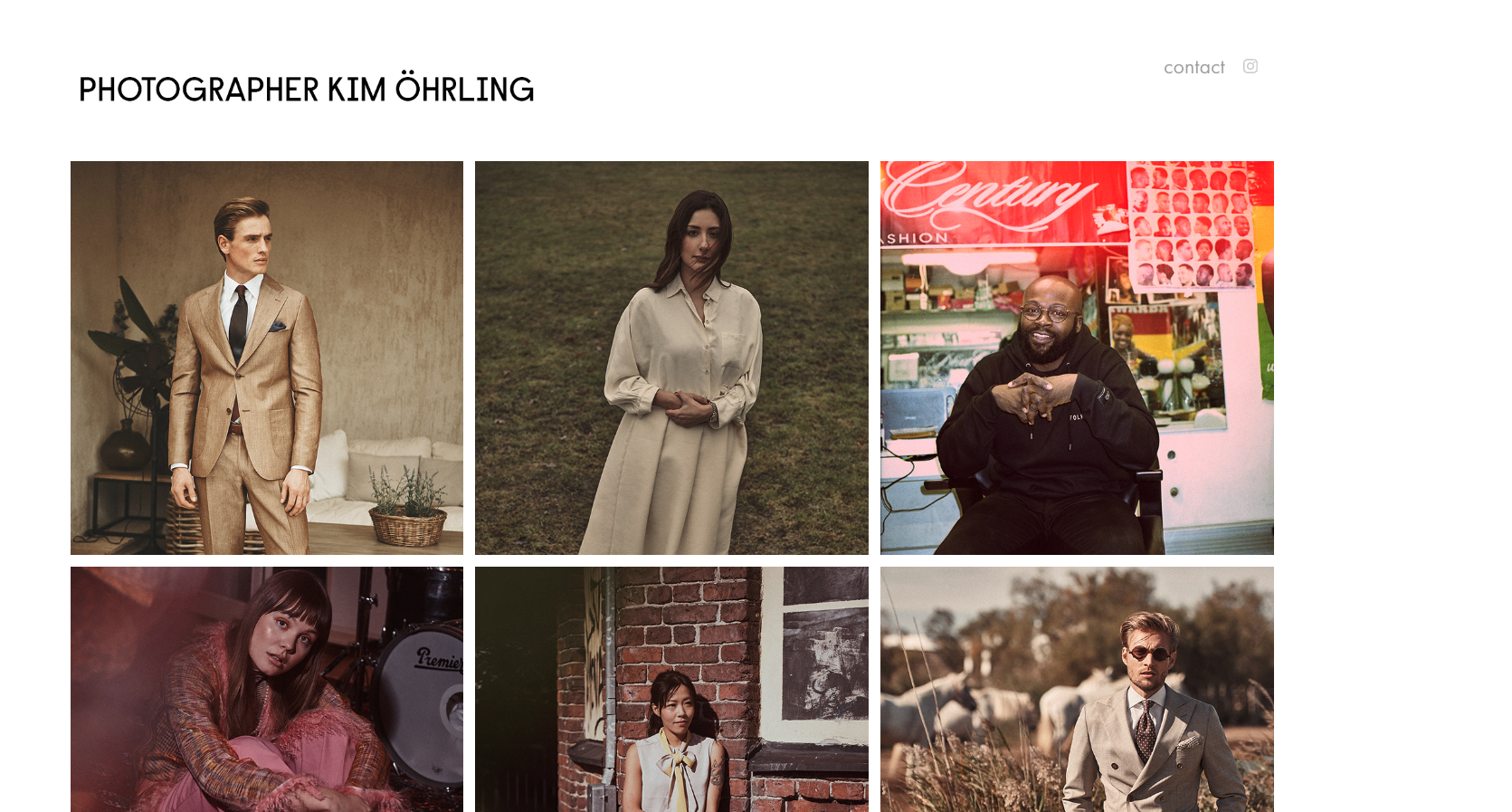 Photographer Kim Ӧhrling’s portfolio displays a selection of their recent work, with links to their contact information and Instagram account at the top right of the page:
