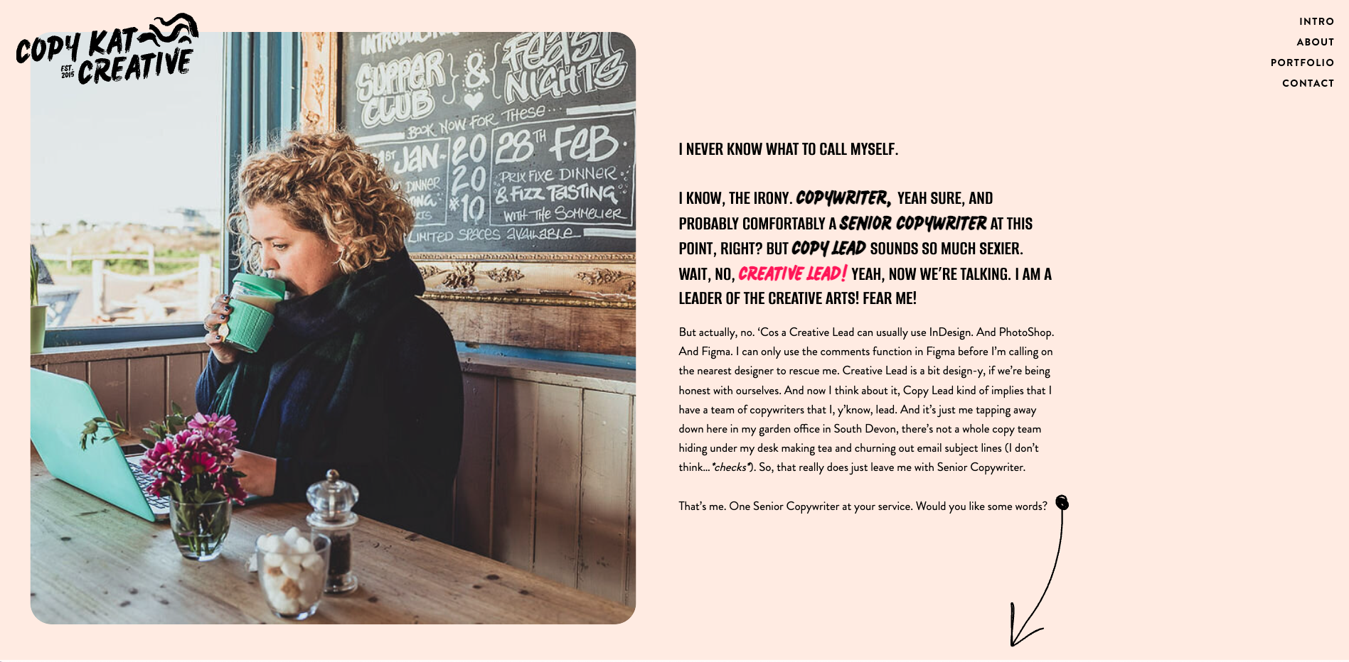 Copywriter Copy Kat Creative’s lively portfolio homepage is structured to have a convenient navigation sidebar with links to the portfolio, contact info, and about sections.