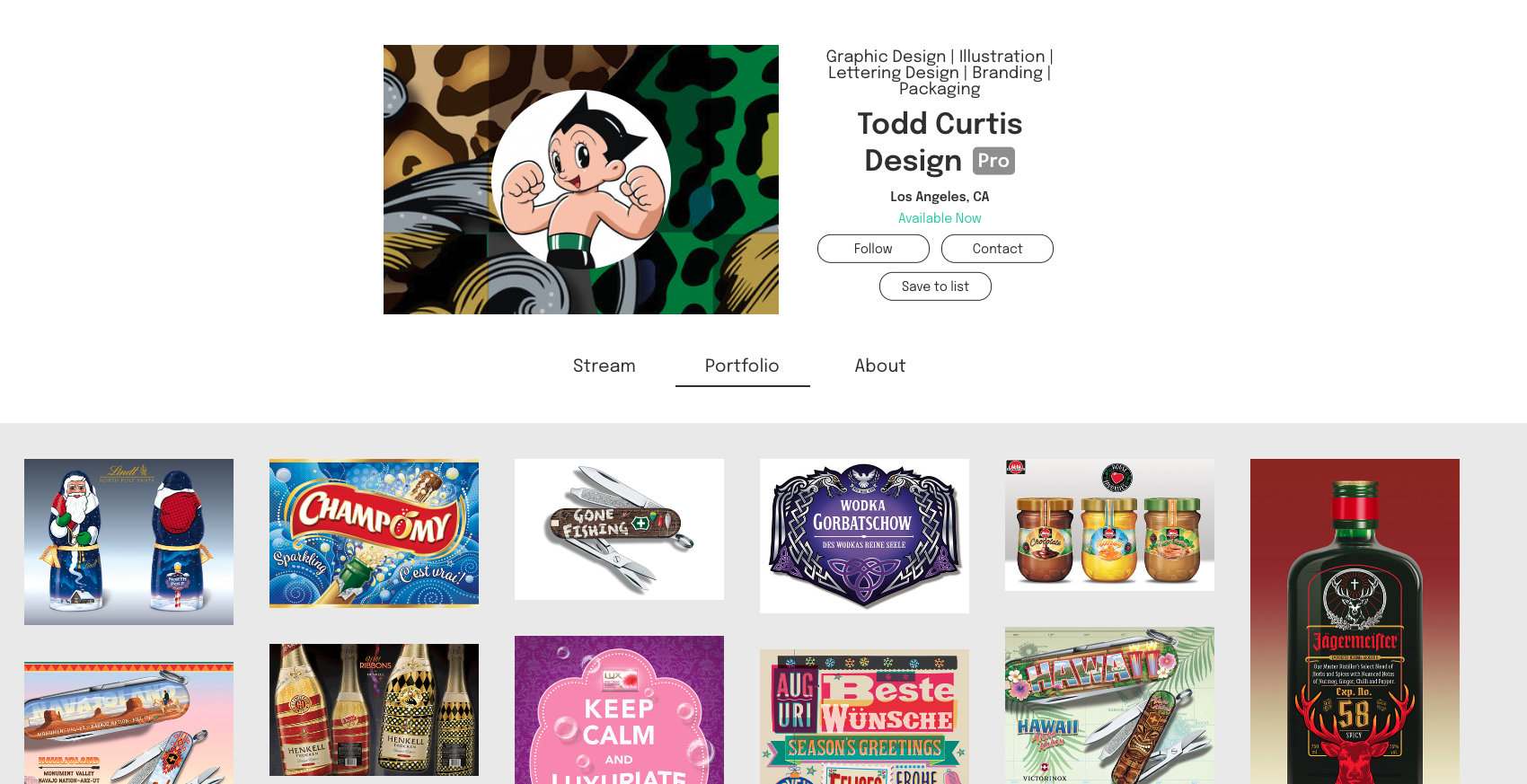 Most portfolios on Coroflot resemble this one from graphic designer Todd Curtis, which has a profile picture, name and title, contact information, and portfolio examples.