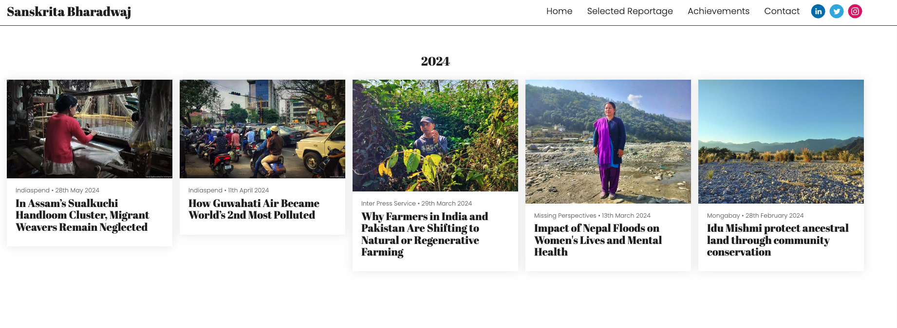 Journalist Sanskrita Bharadwaj uses their portfolio to display their work sorted by year. Links to their contact information and social media platforms are at the top right of the webpage.