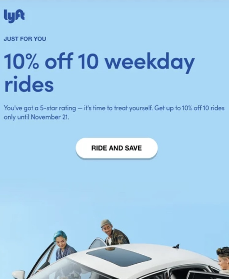 For instance, this CTA from rideshare company Lyft cleverly encourages action with the phrase “ride and save” instead of something basic like “Enter your email address.” Rather than simply demanding information, this copy puts the focus on the benefits to the user: