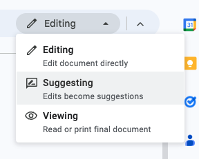 Some clients may prefer to use Google Docs, particularly if they are working with more than one person to create the document. Thankfully, Google Docs has a function that allows you to track the changes you make to a Google Doc. It’s called Suggesting Mode. At the top right of a Google Doc page, there is a pen icon with the word Editing beside it. Use the drop-down menu to select Suggesting.