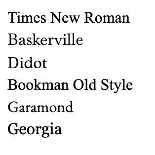 Some examples of widely used serif fonts include Times New Roman, Baskerville, Didot, Bookman Old Style, Garamond, and Georgia: