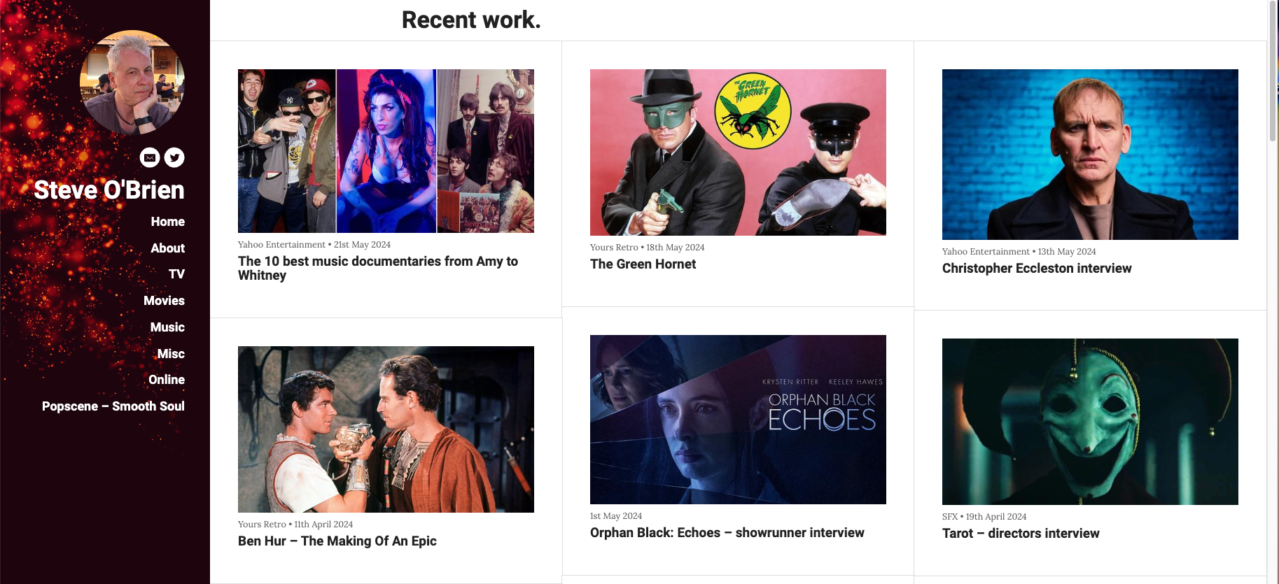 This portfolio, of freelance journalist Steve O’Brien, is kept up to date very well. His most recent work is on a separate page, making it easy to find, and each page includes his photograph, making it personal.