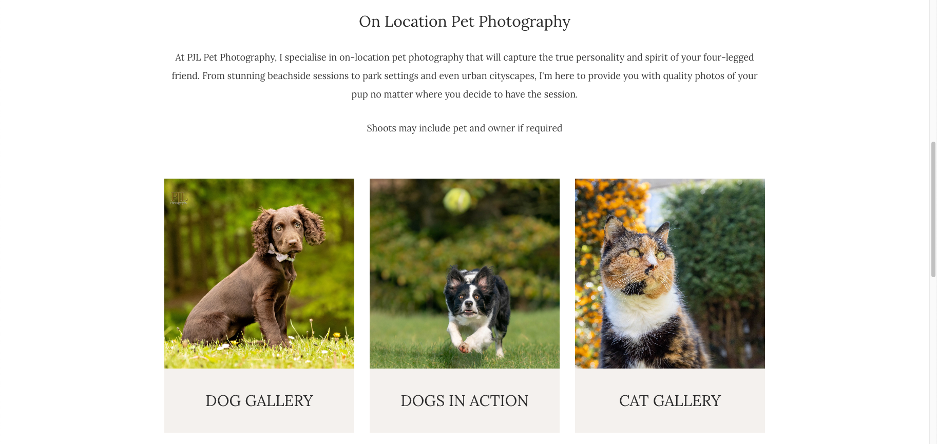 This portfolio from PJL Photography clearly shows a specialty in pet photography – as well as a passion for pets. The portfolio has separate sections for cats and dogs, making it easy for customers to see how his services might be a good fit for them.