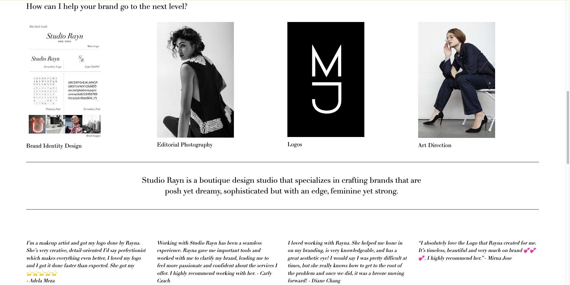 The portfolio of freelance graphic designer Studio Rayn recognizes the importance of testimonials by putting them on the landing page.