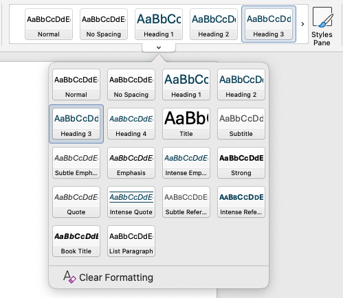 These options can all be found under the ‘Home’ tab. Headings and subheadings can be selected from the ‘Styles’ subsection. Typically, you should use Heading 1 for the main headings, Heading 2 for subheadings, Heading 3 for sub-subheadings, and so on: