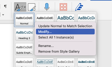 Styles can be found under the ‘Home’ tab. Right click on a style and then choose ‘Modify…’ to get all the formatting options: