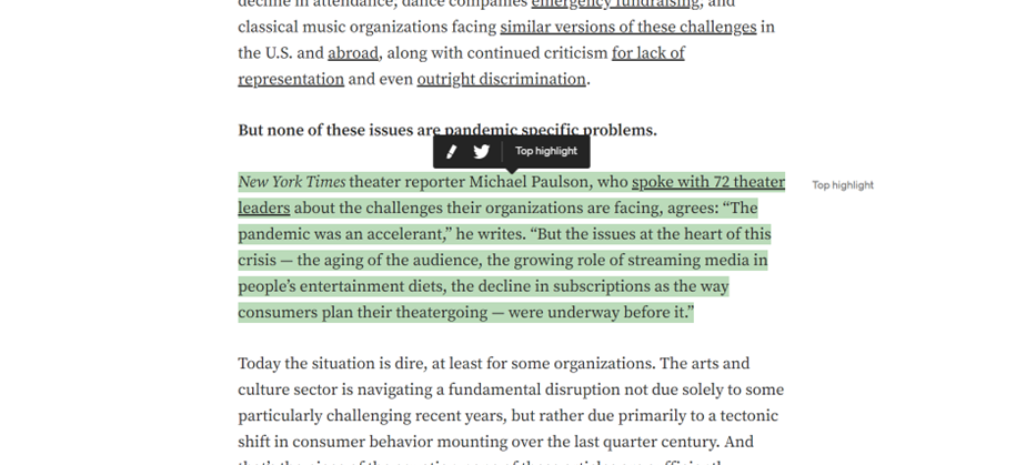 Medium has a highlighting feature that allows readers to highlight phrases in the text and displays the most highlighted areas. This feature makes it easier for skim readers to locate the key sentences they might want a closer look at.