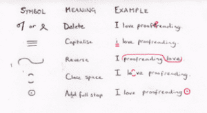 In the old days, there was no option of offering two copies of a proofread document, one clean and one with tracked changes. The changes were always ‘tracked’, manually, using proofreaders’ (or editors’) marks. These are the esoteric marks in the margins and between lines, typically drawn in red, which many people still think of today when they think about proofreading. These marks have changed over time, and also differ from place to place, but here is an example of how some are written.