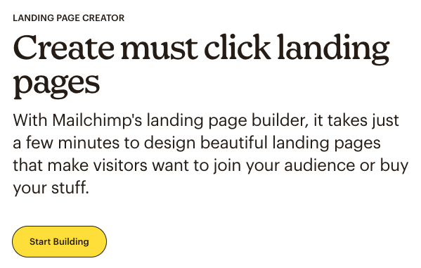An example of this can be found on this landing page for Mailchimp where the copy for their landing page builder emphasizes simplicity, benefits, and easy sign-up.