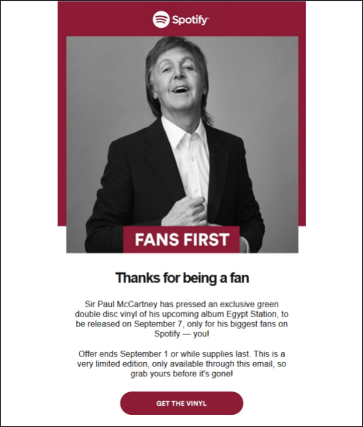 You may have received a “Fans First” email from Spotify that’s like the one below. It’s written to feel personal and exclusive and uses phrases like “very limited edition” and “grab yours before it’s gone” to direct you to click that big “Get the Vinyl” button.