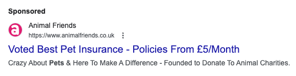 The copy for the following PPC ad for Animal Friends highlights its niche, social conscience, trustworthiness, and affordability, all within 135 characters.